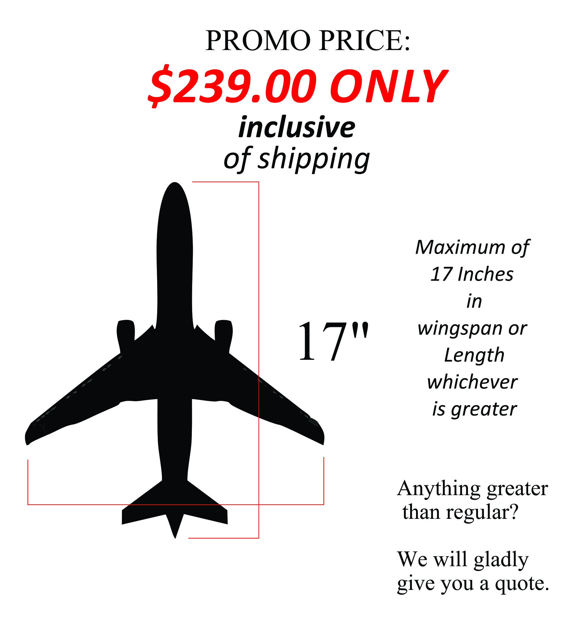 Though our pricings are for a specific size, don't be shy and email us if you want to get a quote for a bigger or smaller size. inquiry@asiancraftairplane.com